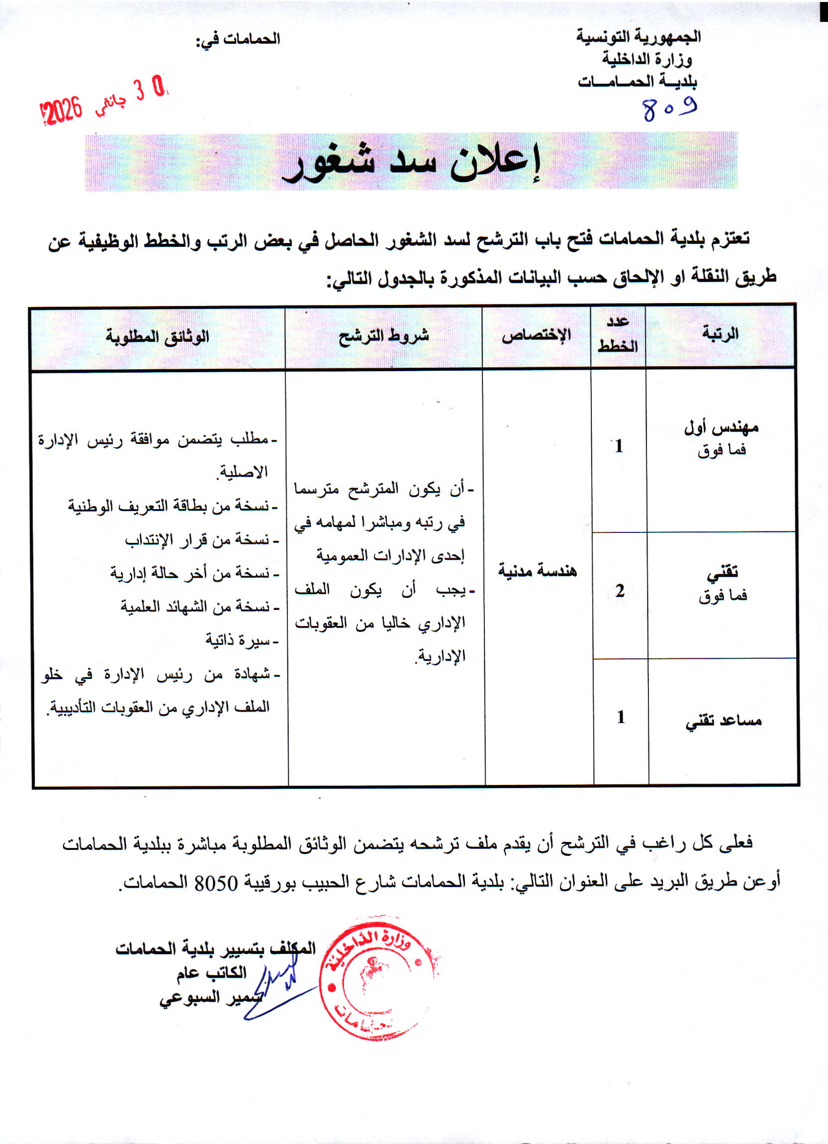 مقرر ظبط عدد الخطط المراد سد شغورها لانتداب عملة بصفة تعاقدية لبلدية الحمامات لسنة 2025